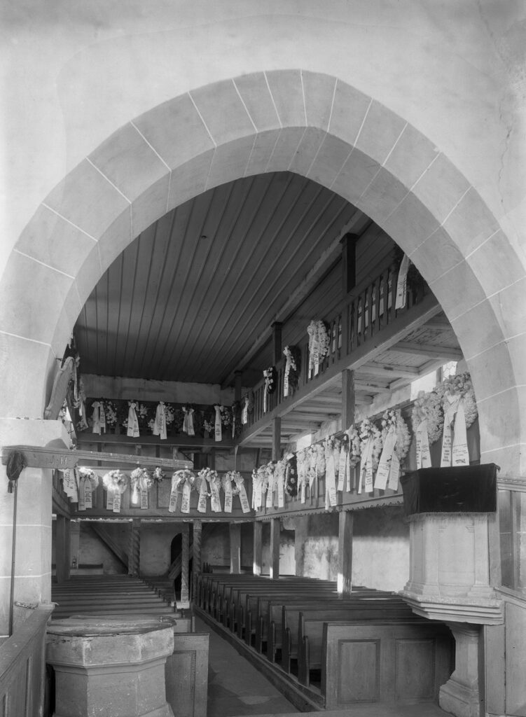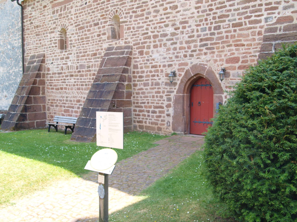 Auch der Turmhelm mit den vier Ecktürmchen wurde erst 1520 aufgesetzt. Die außen sichtbaren mächtigen Strebepfeiler weisen auf eine hohe Belastung der Wände hin, verursacht durch die steinerne Gewölbedecke des Kirchenschiffes. Im Jahr 1817 wurde diese Gewölbedecke aus dem Kirchenschiff herausgebrochen. Mit dem so gewonnenen Baumaterial hat man dann das Kirchenschiff erhöht. Der Maueransatz ist deutlich zu erkennen. Durch die Erhöhung des Kirchenschiffes konnten zwei übereinander verlaufende Emporen (siehe folgendes Bild) eingebaut werden. Und damit nun auch genügend Licht einfallen konnte, wurden die kleinen romanischen durch große klassizistische Fenster ersetzt.