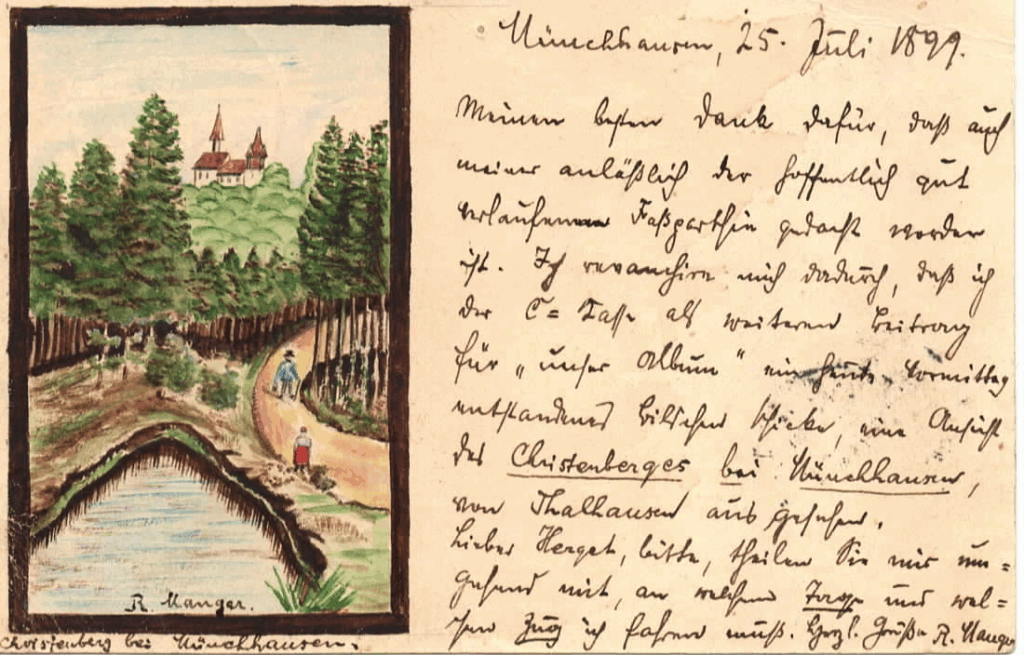 Bei Recherchen in den Häuserbuchakten fand Armin Weber einige Hinweise zu «R. Manger»: Der Zeichner und Verfasser der Postkarte könnte Rudolf Albert Manger gewesen sein. Rudolf Albert (*1868 +1942 Frankfurt, 1892 Oberpostassistent in Cassel, heiratete 1892 in Kassel Martha Elise Kettig aus Melsungen. Die Eltern von Rudolf Albert Manger waren Heinrich Manger (*1842 Wetter +1923 Biedenkopf), Schönfärber, Kaufmann und Elise (Elisabeth) Marie Wilhelmine Christiane Hosch, Ludwig Hoschs Witwe, die 1866 geheiratet haben. Die Mutter lebte in Münchhausen im Haus Nr. 58, heute Marburger Str. 68. Das Ehepaar bekam sechs Kinder.