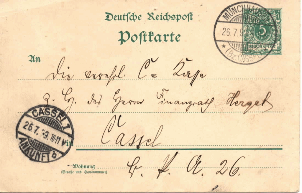 … erhielten wir aus Melsungen, herzlichen Dank dafür! Das Motiv der Karte zeigt den Blick vom Spiegelteich bergan über den Wald bis hinauf zur Martinskirche. Die Zeichnung hat R. Manger am 25. Juli 1899 angefertigt und die Karte dann sogleich mit einem Gruß an Finanzrat Herget in Cassel versandt.